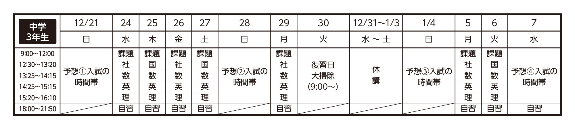 定期考査も終了しいよいよ年末ですね。部活動や習い事に精を出していることと思います。中学1・2年生の今回の冬期講は、都合に合わせて日程、登塾時刻ともに自由に選べます!今年の締めくくりとしてKaishin Aspireでこれまでの総復習を行い、充実した冬休みにしませんか?